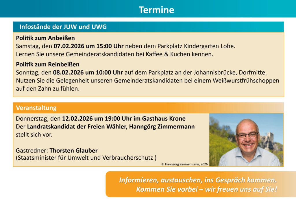 Wir als Junge Unabhängige Wähler sind engagierte Bürgerinnen und Bürger, die für sachorientierte, transparente und bürgernahe Kommunalpolitik mit besonderem Hinblick auf die Bedürfnisse aller Generationen stehen. Unsere Zukunft liegt darin, junge Bürgerinnen und Bürger aktiv einzubinden und die Kommunalpolitik moderner, lösungsorientierter und verantwortungsvoll weiterzuentwickeln. Ziel ist es, die Gemeinden lebenswert zu erhalten, verantwortungsvoll weiterzuentwickeln und Entscheidungen stets am Gemeindewohl auszurichten – unabhängig, offen und nah an den Menschen.
