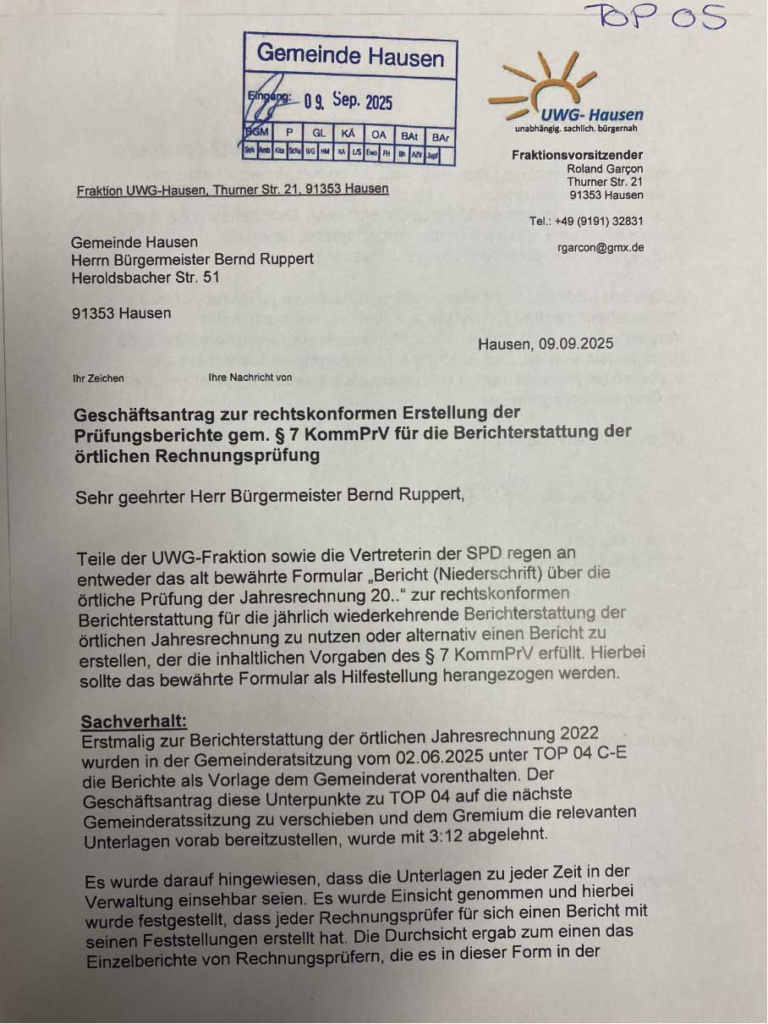 TOP 5: Unter diesen Punkt stand unser UWG-Antrag auf eine rechtskonforme Berichterstattung der örtlichen Rechnungsprüfung an.