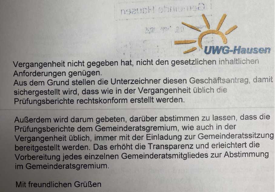 Der Bürgermeister lehnte den Antrag mit den Worten ab, dass sich jeder Gemeinderat in der Gemeindeverwaltung die Unterlagen anschauen kann (Anm. wohlwissend, dass kein Gemeinderat sich auf den Weg in die Gemeindeverwaltung macht und auch nicht weiß nach welchen Unterlagen überhaupt Ausschau gehalten werden soll).
